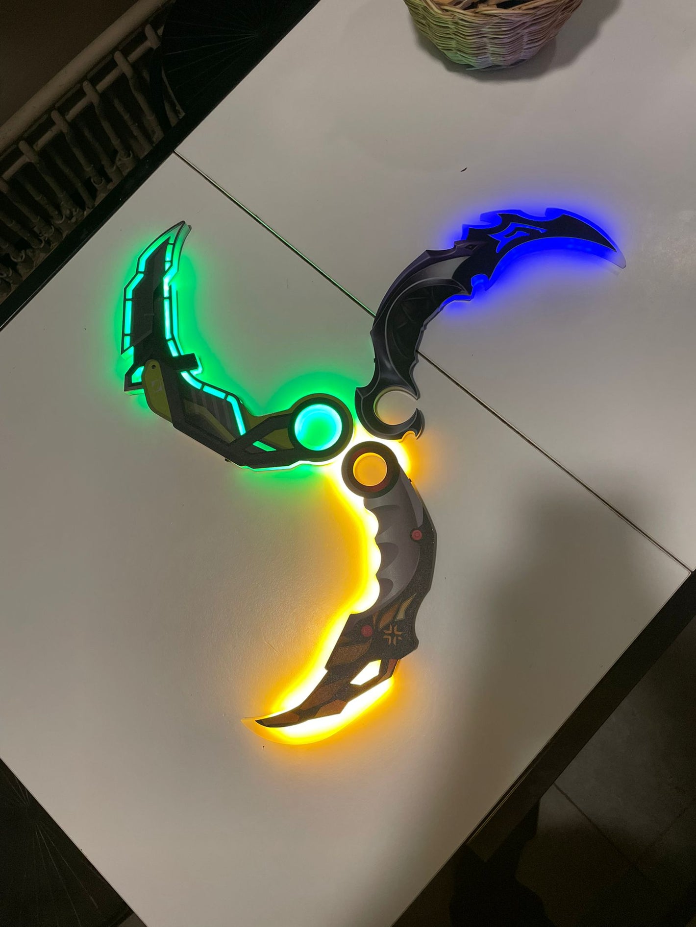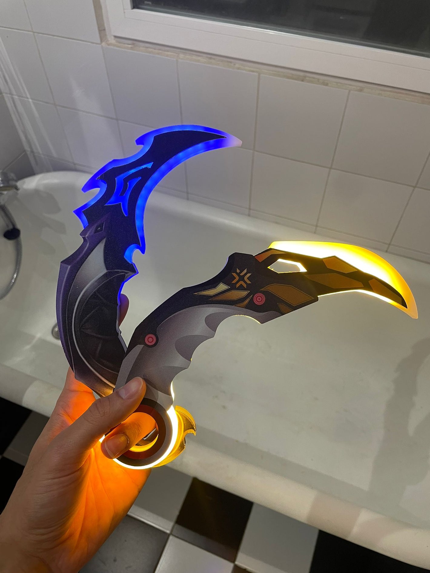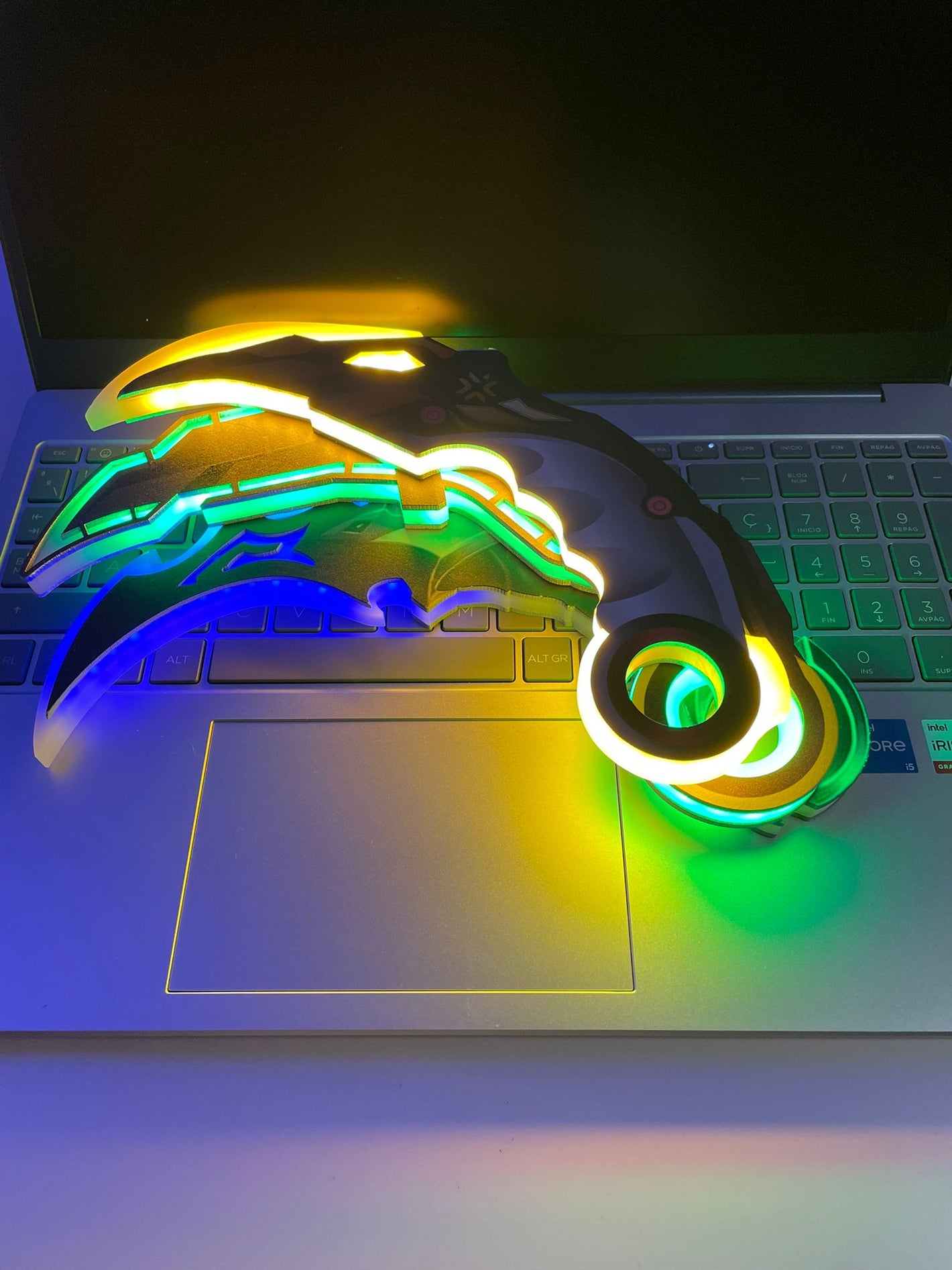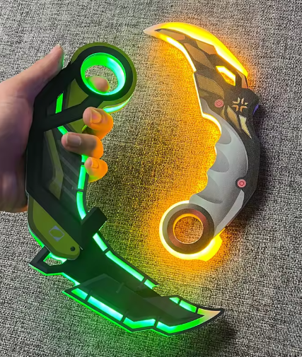 No batteries needed — ever. The karambit charges via USB cable, just like your phone. Plug it in, let it charge, and it's ready to glow. No running to the store for batteries, no unexpected shutdowns mid-display. Just plug, charge, and flex.
